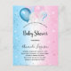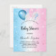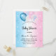 Para um gênero revela chá de fraldas, um fundo de gradiente azul e rosa. Decorados com balões azuis, cor-de-rosa e brancos. Personalize e adicione o nome da mãe a ser e os detalhes da festa. O nome e o texto: Chá de fraldas são escritos com um script de estilo manuscrito