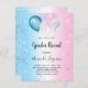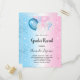 Para um gênero revela chá de fraldas, um fundo de gradiente azul e rosa. Decorados com balões azuis, cor-de-rosa e brancos. Personalize e adicione o nome da mãe a ser e os detalhes da festa. O nome e o texto: Rever de Gênero são escritos com um script de estilo escrito à mão. Traseira: fundo azul e branco gradiente, brilho e design postal. Dica: Se você não quiser que pareça um cartão postal, clique em personalizar, vá para o verso e remova o divisor e o carimbo de posto.