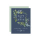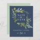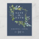Este marinho verde de verão para salvar o cartão postal do anúncio é perfeito para um elegante casamento no meio do verão. O design botânico apresenta um arranjo exuberante de cor d'água pintada de eucalipto, verde e folhas verdes com sutis manchas de flores cor-de-rosa esbranquiçada sobre fundo azul marinho.