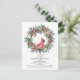 A beautiful red cardinal is framed by an elegant winter wreath. it is decorated with red flowers and berries along with pinecones. This timeless watercolor design features trendy calligraphy to give it a modern vibe. It's the perfect way to invite friends and family to a special occasion.