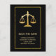 Cartão postal de graduação para salvar a data. Projetado com uma imagem de balanças douradas em um fundo preto. Uma moldura de folha dourada falsa cerca o design. Simples e elegante.