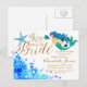 Tema de sereiazinha azul coral aquarela sob o mar com o cabeçalho "Aqui vem a Noiva" ganha vida com efeito brilhante dourado. Convite de chá de lingerie postal. Isso transformará seu casamento temático marinho em uma incrível maravilha aquática para os convidados. Convite perfeito para celebrações de festa na praia ou à beira-mar.
