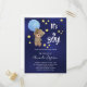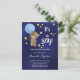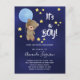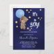 Para um chá de fraldas celebrando um menino. Um fundo azul marinho e estrelas amarelas. A cor azul é irregular. Um ursinho de pelúcia segurando um balão azul claro. Personalize e adicione o nome da mãe a ser e os detalhes da festa. O nome e o texto: É um Rapaz! são escritos com um estilo escrito à mão. Traseiro: design postal. Dica: Se você não quiser que pareça um cartão postal, clique em personalizar, vá para o verso e remova o divisor e o carimbo de posto.