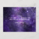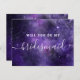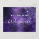Cartão de narração roxo "Você será minha dama de honra?" no tema da noite espacial.
