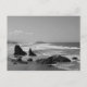 As rochas ruidosas sobem da praia enquanto as ondas oceânicas rolam preguiçosamente em terra. Contrastes entre preto e branco e cinzas, deixando de fora distrações da forma e expandindo a visão do oceano