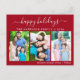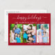 Cartão-postal vermelho simples, com colagem de 3 fotos. Personalize a saudação (inicialmente "feriados felizes") em um roteiro branco na moda com baloiços. Adicione o nome da família, os nomes e o ano.
