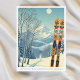 Olá das montanhas nevadas de Snowshoe, West Virginia, EUA! Esperamos que você esteja tendo umas férias de esqui maravilhosas. Este cartão postal apresenta uma paisagem montanhosa azul-cinza deslumbrante com pranchas de esqui retrô em um padrão tribal laranja.