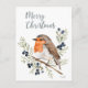 Este encantador cartão de férias com ilustração charmosa apresenta uma doce ilustração em aquarela de um robin europeu empoleirado em um galho de bagas de inverno e folhagens. O peito vermelho icônico do pássaro é lindamente destacado contra os verdes suaves e azuis escuros das bagas, dando ao design uma sensação aconchegante, rústica e natural. A letra cursiva elegante lê "Feliz Natal", tornando este cartão uma escolha adorável para enviar votos calorosos e tradicionais com um toque lindo inspirado na natureza.