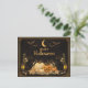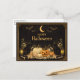 A glamorous Art Deco–inspired Halloween illustration in rich black and radiant gold. A crescent moon and shimmering stars illuminate the night sky as graceful bats glide overhead. Framed by bold geometric borders, two elegant black cats sit symmetrically beside glowing lanterns and a cluster of heirloom pumpkins, including a smiling jack-o’-lantern softened by floral accents. The refined typography and metallic palette evoke Jazz Age sophistication, blending Halloween charm with timeless luxury.