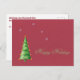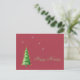 Cartão postal "Feliz Feriados" com fundo de papel vermelho, com uma árvore de abeto decorada e flocos de neve. Duas linhas de texto personalizável no verso.