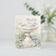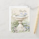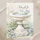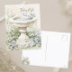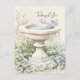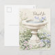 Cartão postal "Pensando em Você" apresentando uma ilustração em aquarela de um banho de pássaros cercado por um jardim de flores azuis e rosas e folhagens crescendo ao redor da base do banho de pássaros. A folhagem é representada em vários tons de verde. Um fundo bege neutro em aquarela e cores pastéis e suaves contribuem para uma estética serena e suave. A frase "Pensando em Você" em uma fonte cursiva e fluida no canto superior direito da imagem. A ilustração do banho de pássaros é repetida no verso, no canto inferior esquerdo. Uma ilustração serena complementada por uma mensagem calorosa e sentimental.