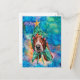 Basset Hound Raça Cão Natal apresenta uma aquarela de um Basset Hound com uma capa com capuz verde de Natal e uma aquarela de galáxia.