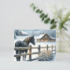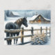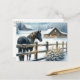 Cartão postal personalizado de Natal. Bonito cavalo preto numa fazenda rústica decorando em decorações festivas de Natal.