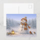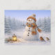 Cartão Postal De Festividades Boneco de Neve Aconchegante em Aquarela com Pássar