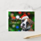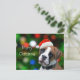 Cachorro branco e desfiladeiro veste um chapéu de Papai Noel muito pequeno e fica bonito com luzes de Natal brilhantes no cão de fundo amante cartão postal de Natal