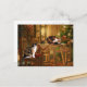 Two calico or tortoiseshell with white kitties in a Christmas setting.......one sitting prettily on a chair the other cleaning herself on a table in typical cat fashion.......cat lovers holiday greeting postcard