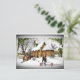 Um "Feliz Natal". Um grupo de vilarejos caminhando pela neve até a igreja. Igreja ao estilo europeu com o estilo Tudor.