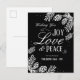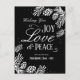 Divertido cartão corporativo de Natal com design de pinhas e galhos de pinheiro. O texto diz Desejando alegria, amor, paz de seu amigo na "adicione o nome da sua empresa". Todo o texto é ajustável. Há um texto interno que pode ser alterado para sua própria mensagem ou excluído para assinaturas personalizadas.
