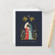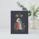 Este cartão de Natal apresenta uma ilustração da sagrada família emoldurada por um par de palmeiras, a estrela de Belém e lírios brancos. Este design íntimo captura o milagre e a intimidade do nascimento de Jesus.