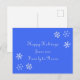Mande um pouco de alegria para seus amigos e famílias nesta temporada. Cartões postais são uma forma excelente de enviar um cartão simples sem os envelopes extras e o correio. Este design tem um fundo azul com flocos de neve brancos e mensagem simples. Personalize a parte de trás com saudações padrão ou ordem de lugar com o vazio para preencher uma mensagem personalizada para cada destinatário.