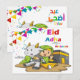 Eid Adha Mubarak design com personagens de desenho animados 2 lados saudações em árabe e inglês