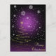 Uma ilustração de Natal brilhante e nevada, com uma árvore de natal brilhante e flocos de neve sobre fundo roxo.