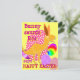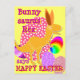 Bunnysaurus Rex diz Felz pascoa postal. Um desenho animado engraçado e engraçado do Bunnysaurus T-rex com orelhas de coelho com ovos de páscoa coloridos com pontos e listras coloridas arco-íris e texto "Bunnysaurus Rex diz Felz pascoa". Este cartão postal de páscoa de excelente é totalmente personalizável, adicione seus textos e imagens. Um belo e engraçado cartão postal T-Rex para o grande pequeno fã de dino!