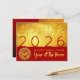 Design moderno com papel texturizado a ouro (imagem impressa) com grandes desejos chineses de ouro + grande 2026 em papel vermelho + pequeno Corse recortado num círculo com textos amarelos FELIZ ANO NOVO e Ano do Cavalo sobre fundo vermelho. Design no cartão postal de feriado horizontal + textos para personalizar no verso. Você pode mudar facilmente o ano clicando no botão personalizar. Cartão de saudação, adesivo, suprimentos de festa e mais cedo... Perfeito para um eterno e moderno Ano Novo Chinês do Cavalo 2026.