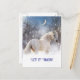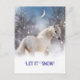 Um belo cavalo branco parado na neve sob uma delicada lua crescente. "Deixar nevar" aplaude a frente, mas o texto pode ser personalizado. Um cartão postal de Natal Feliz Feriados encantador.