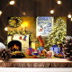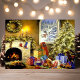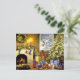 Linda cena de sala de estar de Natal antiga em cartão postal. Este design apresenta uma bela lareira decorada com guirlanda iluminada, meias, e velas. Há um boneco de neve espiando pela janela e uma pilha de presentes sentados sob a árvore de Natal decorada e iluminada. Que linda cena de feriado.