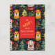 See these cute little dogs decorate a festive Christmas postcard in an adorable Yule pattern. The doggies say "We Woof You A Merry Christmas" to your pet loving friends and family members. The design reflects the bright art of fauvism and folk art. The black background sets off the bright colors. Christmas trees, greenery, and delightful berries, leaves, and other adornments of the winter season fill out the picture. All of the text, which is in yellow and white, can be changed. Be sure to change the example family name and the year to those you pick.