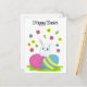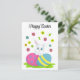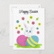 Coelho branco bonito aparecendo por trás de dois ovos de Páscoa coloridos. Sobre sua cabeça estão flores, folhas e espirais. Um modelo no topo lê "Felz pascoa" em script preto.