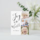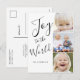 Personalize este design moderno e elegante com letras à mão com a frase "Alegria ao Mundo" em preto e branco. Um cartão de Natal simples e moderno com foto. Elke Clarke ©