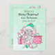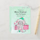 Um rato adorável desenhado num chapéu de Papai Noel segurando uma bengala doce e baleeira de Natal. Basta adicionar seus nomes e mensagens personalizadas na área de personalização. Bonito carta verde e rosa com fundo de flocos de neve.
