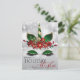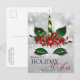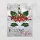 Cartão Postal de Férias | Desejos de Férias mais Quentes em fonte contemporânea e caligrafia moderna. Um fundo bokeh prateado cintilante destaca este Belo Rosto de Unicórnio Verde e Dourado decorado. Ela tem olhos verdes brilhantes com cílios longos e um chifre e orelhas listrados dourados e verdes brilhantes. - ela usa uma tiara floral de poinsettias vermelhas, azevinho e lírios vermelhos - Personalize o texto na parte inferior ou você pode excluí-lo - Este é um design de feriado não denominacional adequado para uso em família ou escritório. Todos os Trabalhos Originais © por WhimsicalArtwork™. Este faz parte de uma Coleção de Férias coordenada e combinável.