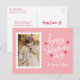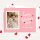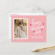 Cartão-postal com foto de Dia de os namorados bonito, com dentro vertical de um quadro de carimbo de correio branco. A expressão "Feliz dia de os namorados" é exibida em letras brancas brancas, brancas, brancas, cercadas por corações vermelhos. Personalize a frente do cartão postal do Dia de os namorados fotográfico com o seu nome de família em letras brancas em fundo cor-de-rosa. O cartão postal se reverte para exibir seu endereço de devolução e sua mensagem pessoal em letras vermelhas.