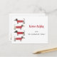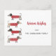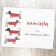 Enchido de Dachshund, bonito e adorável, ou cães salsicha em camisolas festivas de malha vermelha e branca. Altere o nome e a saudação para personalizar. O reverso apresenta um pequeno cão correspondente. Arte original de Nic Squirrell.