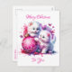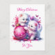 Cartaz bonito de Natal com tema rosa. Dois gatinhos brancos e peludos brincando com um Enfeites de natal cor-de-rosa cintilante. Todo o texto deste cartão de feriado pode ser personalizado.