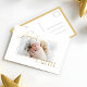 Elevem seu cartões de natal com este design minimalista e elegante com uma borda de gradiente de ouro limpa ao redor de sua querida foto de família. Também apresenta a mensagem "Paz na Terra" do eterno na tipografia personalizada dourada. A parte traseira apresenta campos de texto editáveis e cores de fundo personalizáveis.