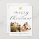 Crie seu próprio cartão postal de colagem de fotos Natal 2 para enviar seus melhores Cartões de natal para amigos e família! A elegante e minimalista design apresenta uma colagem de duas fotos personalizadas no fundo e elegante tipografia no topo com um cabeçalho de "Feliz Natal" em uma escrita de chic e um coração ouro acima, limpando a forma de uma árvore de Natal. Abaixo estão suas saudações, nome da família e data. No verso, há uma mensagem personalizável com seus nomes. Torne-o exclusivo substituindo o texto e as imagens clicando no botão "Personalizar". Uma bela lembrança para lembrar do dia especial!
