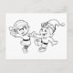 Ilustração a preto e branco de elfos de Natal de criança e menina dançando em roupas de Papai noel e de elfo