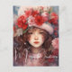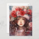 Um buquê de chapéu de peônia vermelha, rosa e marfim, Camellia e flores crisântemo em seu chapéu peludo, esta fada de Natal bonita está te desejando Feliz Natal