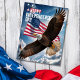 Cartão-postal Feliz Dia da Independência em 4 de julho. Uma águia-careca majestosa a soar com a bandeira americana no fundo simboliza a liberdade e a força. As saudações no fundo, como desejado.