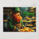Leprocaia-branca numa caverna com ouro (ilustração por AI - modelo n°5). Design no cartão postal de feriado com citação irlandesa e saudação para personalizar no verso.