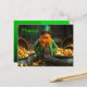 Leprocaia Cuta numa caverna com ouro (ilustração por AI - modelo n°6). Design no cartão postal de feriado com citação irlandesa e saudação para personalizar no verso.