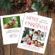 Cartaz de Natal elegante com "Feliz Natal" escrito em na moda vintage, tipografia vermelha, "feliz ano novo" e uma saudação à tipografia vermelha moderna, três das suas fotos favoritas e o seu nome. No verso, adicione uma quarta foto e personalize sua mensagem sazonal à família e aos amigos.