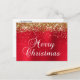 Uma mensagem de texto Feliz Natal em uma folha vermelha falsa e um fundo brilhante de ouro. Um cartão-postal moderno para seus parentes. Crie sua própria mensagem de texto no verso.