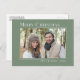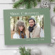 Cartões postais de cartões de natal de Natal, estilo moderno e elegante, com "Feliz Natal", os seus nomes ou nome de família e o ano em nova e sofisticada tipografia. Este design apresenta sua foto favorita destacada por um quadro único de gradiente moderno em verde-sábio bonito. A parte traseira da placa possui um espaço de texto para sua mensagem personalizada ou pode ser deixada a vazio de você escrever uma mensagem manualmente, se necessário.