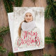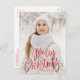 Cartão-postal de feriado bonito com "Feliz Natal", apresentado na parte inferior do cartão, num guião manuscrito vermelho. Personalize o cartão postal branco de Natal com sua foto vertical e seu nome de família. O cartão postal se reverte para exibir seu endereço de devolução, foto adicional e mensagem.