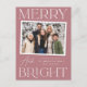 Cartão-postal de férias moderno com a sua dentro horizontal de fotografia instantânea branca. A expressão "Feliz e Brilho" é apresentada em letras brancas com fundo rosa poeirento. Personalize a frente do cartão postal de feriado de instantâneo com a saudação personalizada, o nome da família e o ano. O cartão postal reverte para exibir seu endereço de devolução e sua mensagem pessoal.